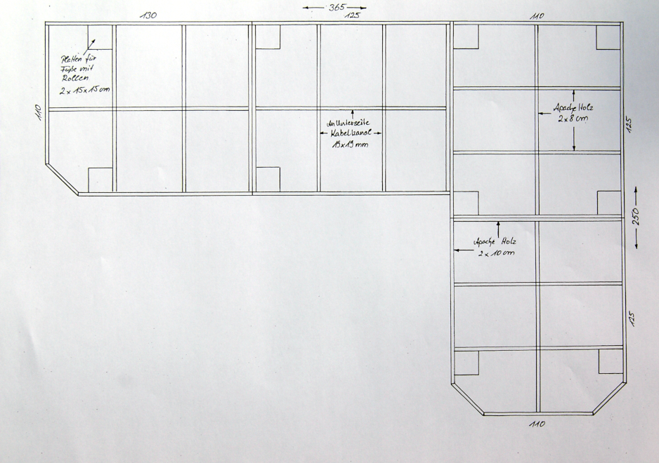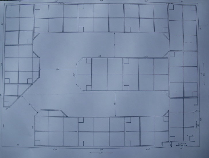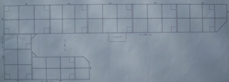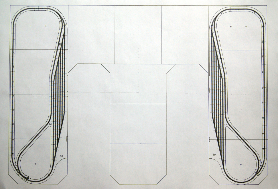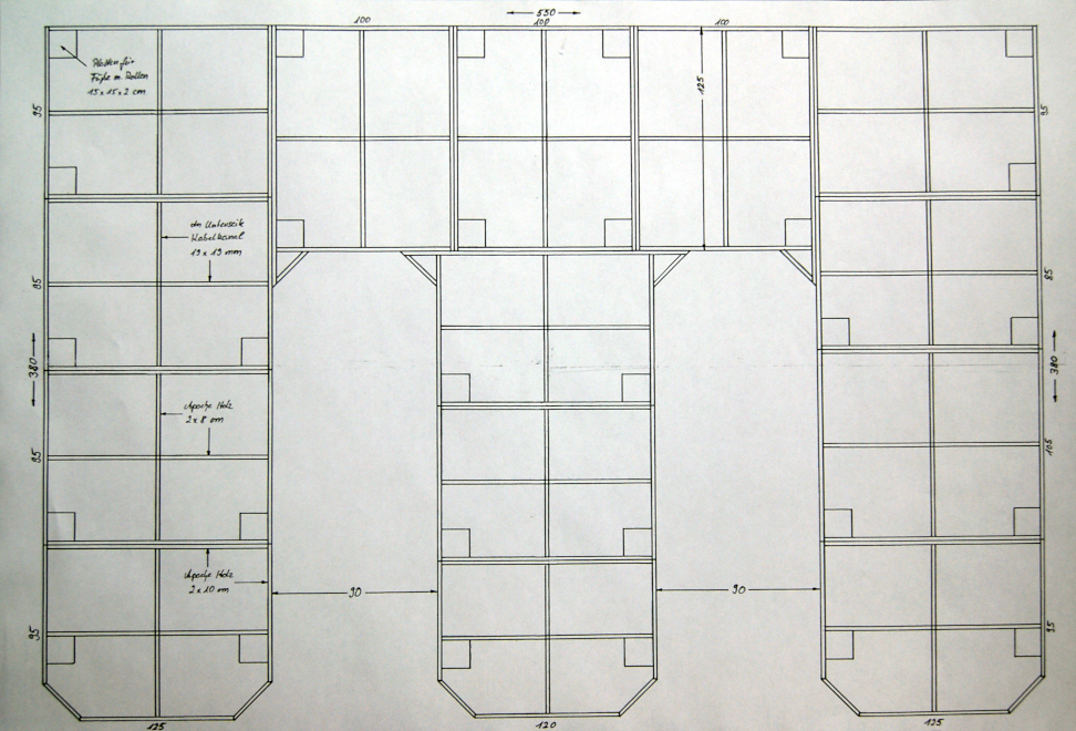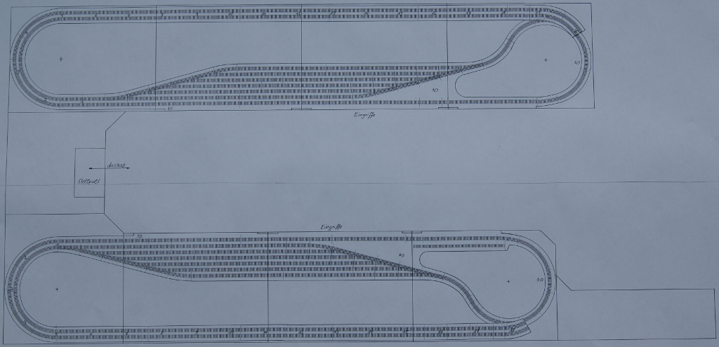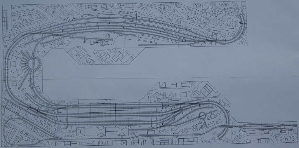 Weiterhin erstelle ich auf Wunsch einen Trassenplan der Anlage. Dieser zeigt den teilbaren Rahmenunterbau der Anlage, die Schattenbahnhofsgleise, die Spanten sowie den Gleisplan. Höhenangaben für die Gleistrassen und die Standorte der Signal- und Oberleitungsmasten fehlen nicht. der Platzbedarf von Straßen und Gebäuden wird ebenfalls berücksichtigt.