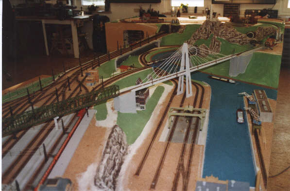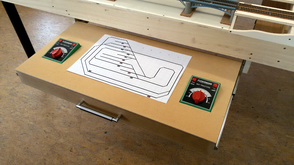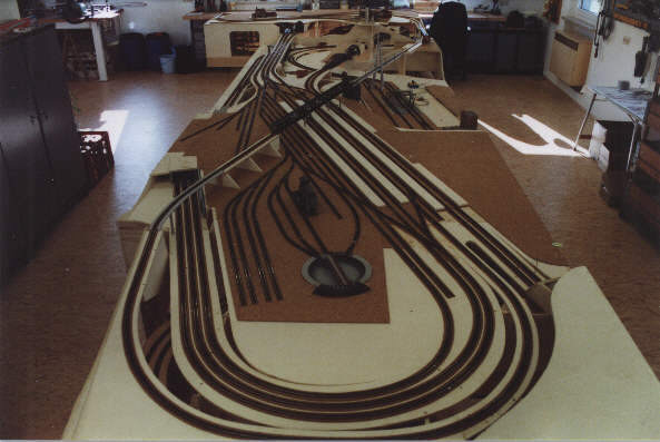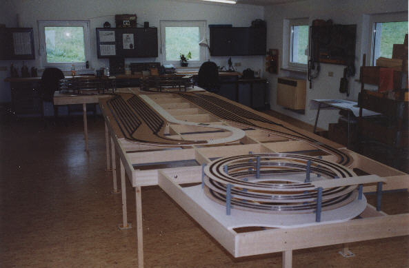 Die Basis dieser Teilstücke bildet ein offener Gitterrahmen aus leichtem und dennoch stabilem Apache-Holz. Die Geländespanten, Trassenstützen, Bahnhofsplatten und Gleistrassen bestehen aus Sperrholz.
